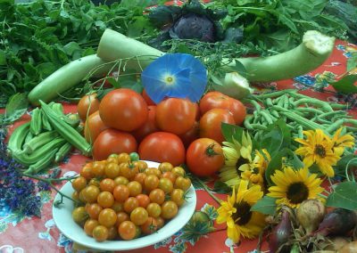 Harvest asparagus, cherry tomatoes, sorrel, rhubarb, herbs, kale, green beans, squash, flowers, etc.